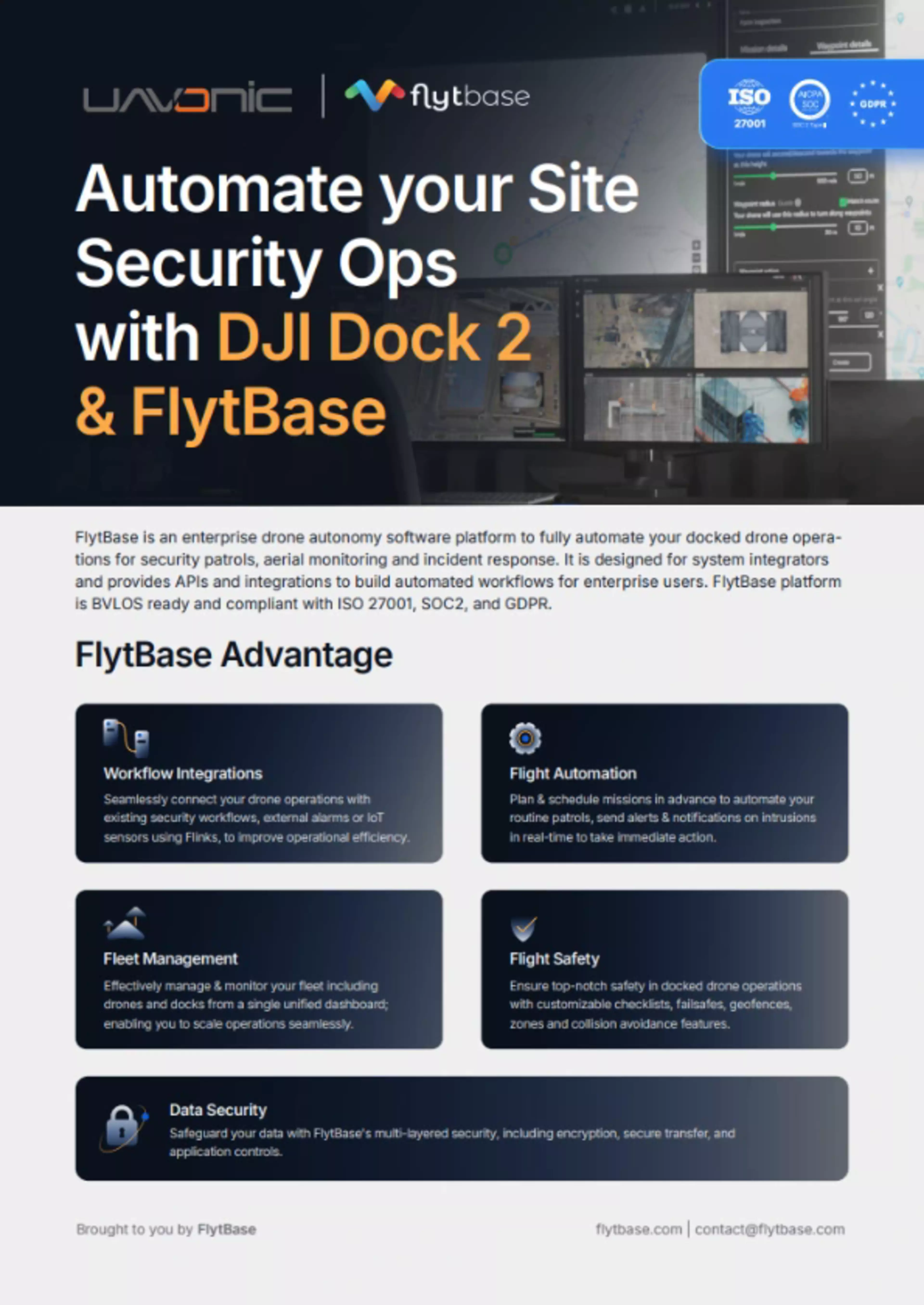 FlytBase umožňuje systémovým integrátorům a podnikům nasazovat a škálovat flotily automatizovaných dronů a dokovacích stanic. Spolehlivá a modulární platforma umožňuje uživatelům kombinovat různé komponenty pro vytváření automatizovaných pracovních postupů, propojení stávajících systémů a analytických aplikací a také integraci s externími poskytovateli řešení BVLOS za účelem získání regulačních povolení.