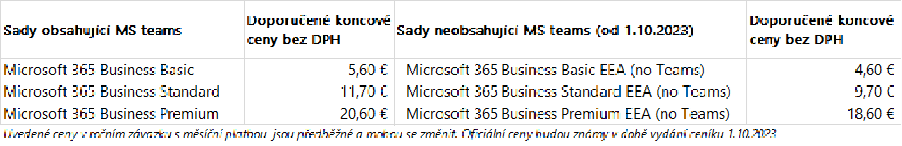 1. Pro Business zákazníky (Basic, Standard, Premium) zůstanou předplatná za stejnou cenu dostupné včetně MS Teams i po 1. 10. 2023 pro nová i stávající předplatná. Novinkou bude možnost pořízení uvedených sad bez MS Teams služeb za nižší cenu. Pro Business zákazníky již nyní v ceníku existuje samostatná licence Business Essentials (3,70 EUR/uživatel).